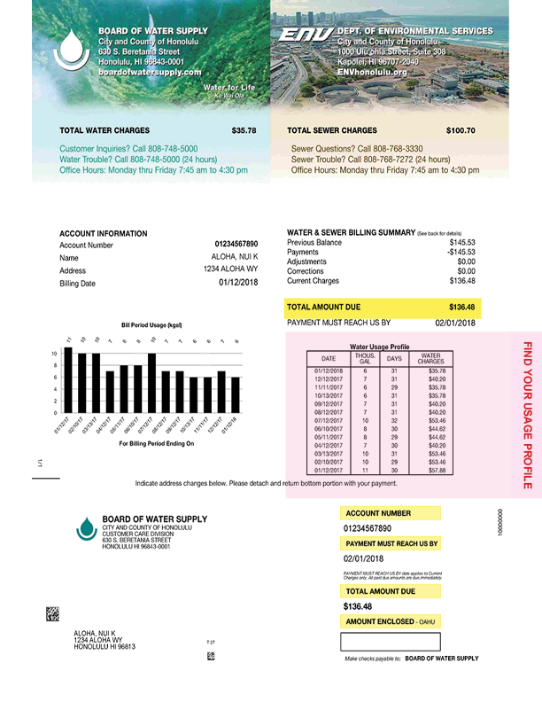 Water consumption data appears on the front of each BWS bill. Look at your December or January bill and add up your water use for the 12-month period desired. For reference, see the sample bill on this page.