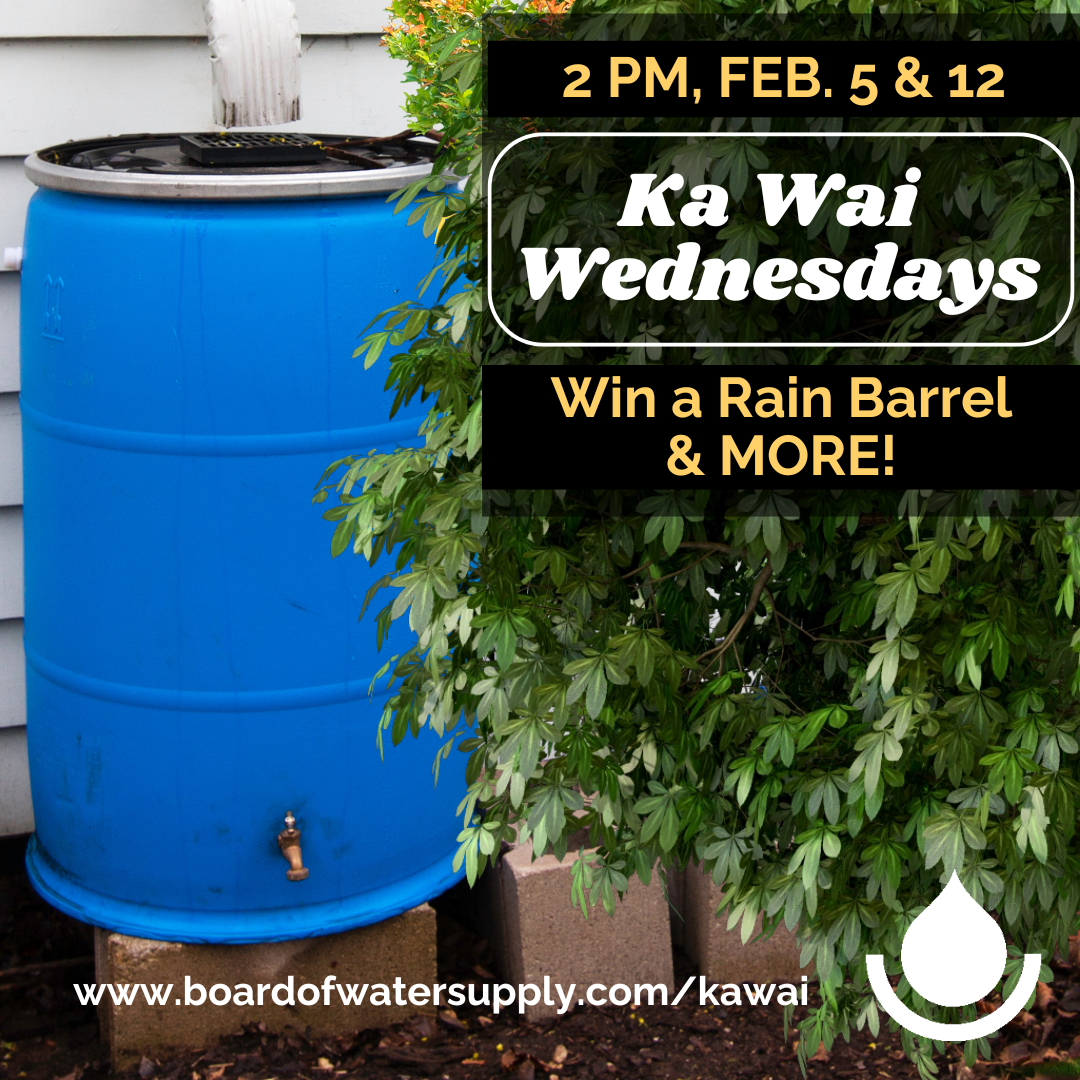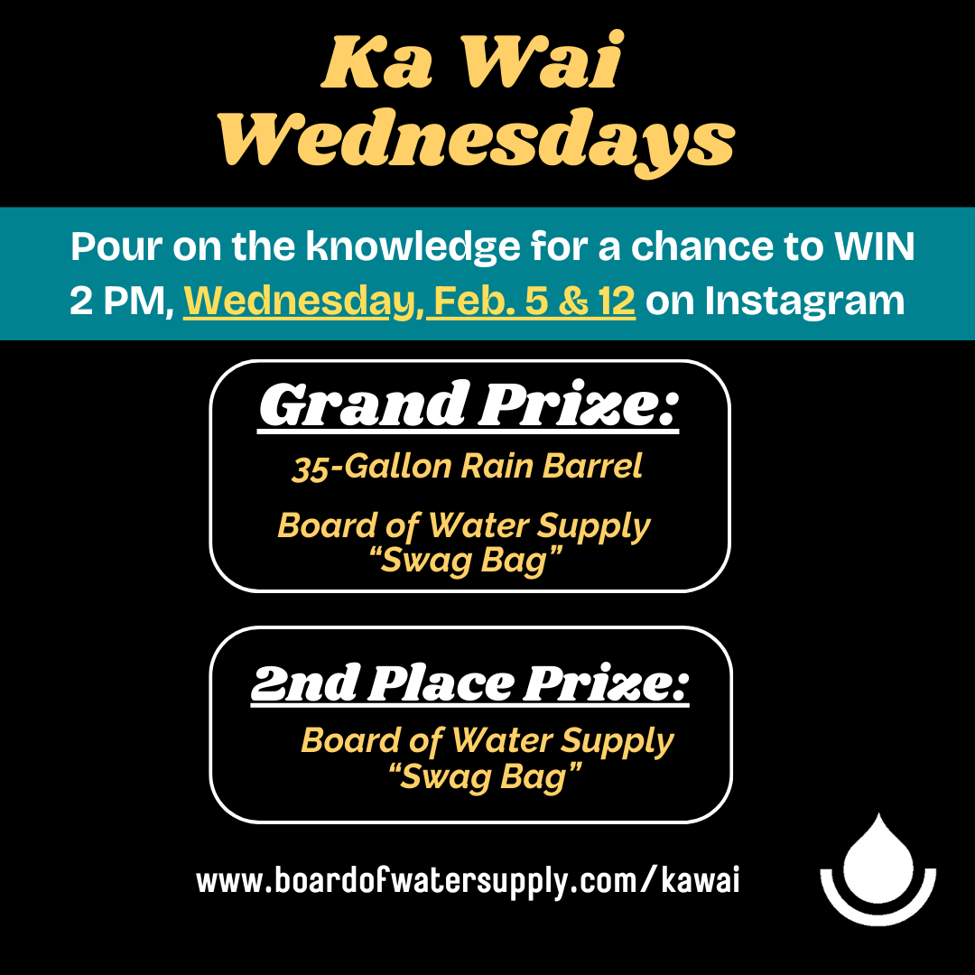 - Campaign Period: A unique multiple choice conservation trivia question will be posted on the Board of Water Supply’s Instagram page, Wednesday, February 5, 2025 and Wednesday, February 12, 2025 at 2:00 p.m., Hawaii Standard Time. Participants must submit their answer within 60 minutes in order to be eligible. There will a total of two winners at 2:00 p.m. each day of the contest. This includes a grand prize winner and 2nd place winner.