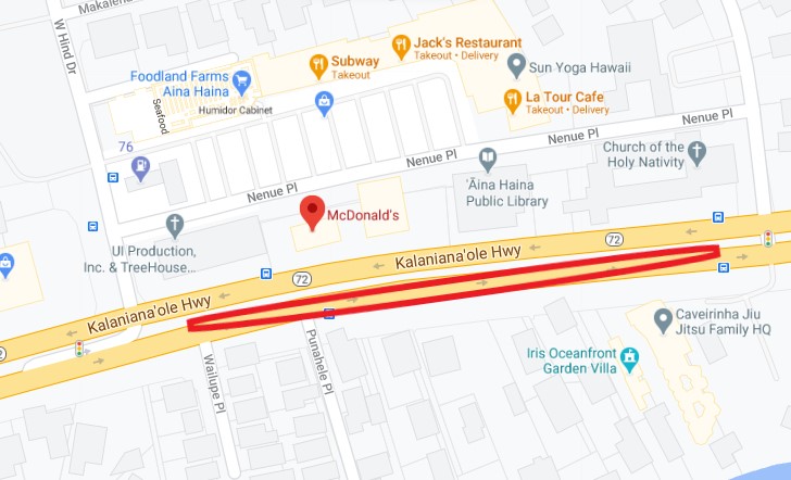 HONOLULU – East-bound motorists on Kalanianaole Highway in Aina Haina are advised to plan for potential traffic impacts overnight from 9:30PM, Fri., Feb. 19, to 5:00AM, Sat., Feb. 20, due to roadwork by a Board of Water Supply (BWS) paving contractor. The contractor will be completing a final paving of a trench in the east-bound lanes of the highway, across the Aina Haina McDonald’s located between West Hind Drive and Nenue St.