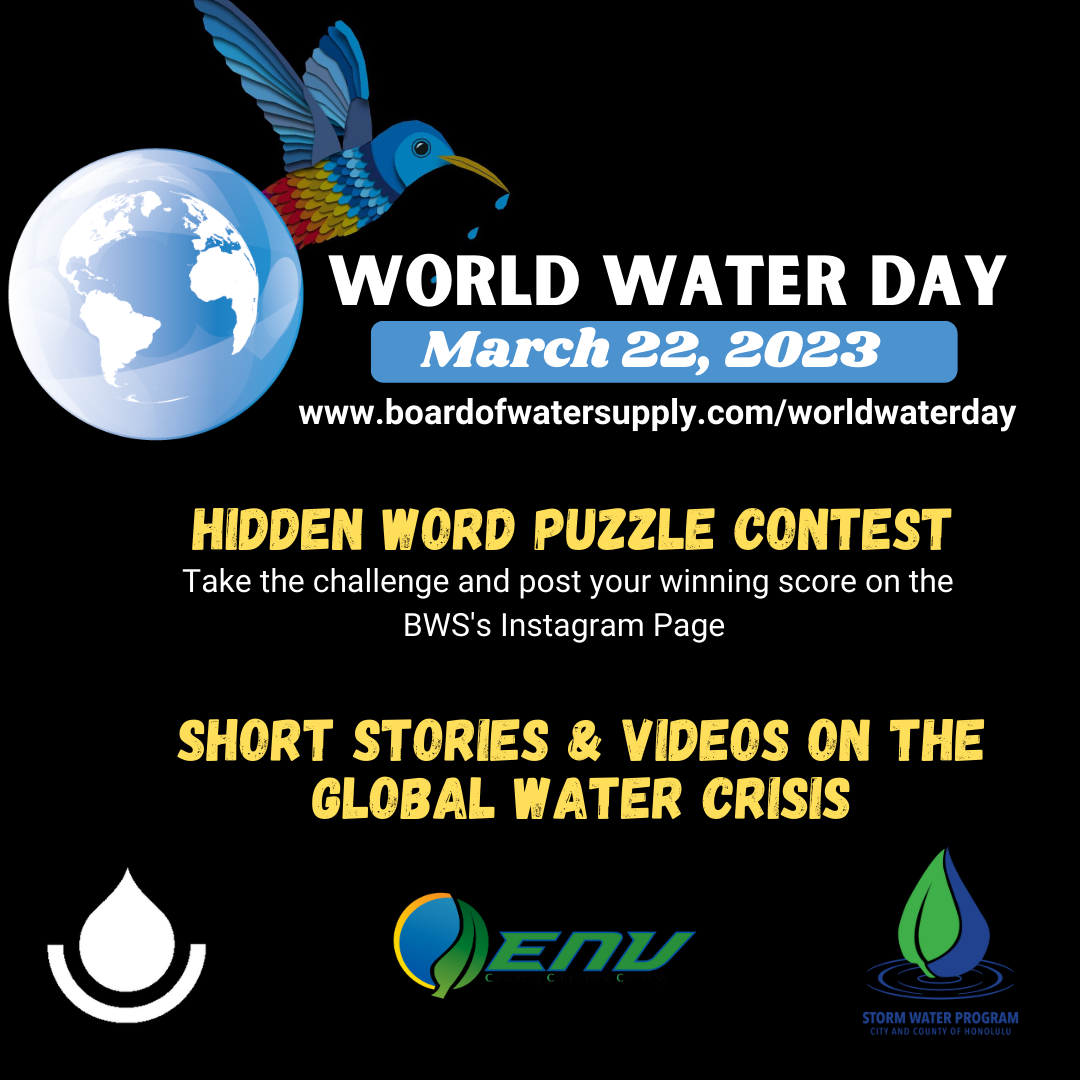 - World Water Day “Hidden Word Puzzle Contest” – From now until March 22 at noon, take the challenge, complete the hidden word puzzle, and post your winning time on the BWS’s Instagram Page (@BWSHonolulu). The top three contestants who finish the puzzle in the fastest time will win a variety of prizes from each participating city agency, including a 55-gallon rain barrel. Complete the puzzle at www.boardofwatersupply.com/worldwaterday. (Please note that the hidden word puzzle may not display correctly on a mobile device and may require the use of a desktop).
